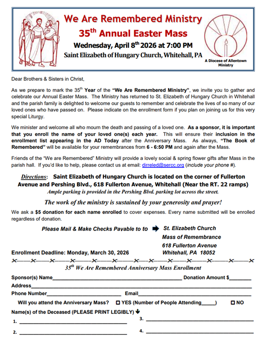 Our Parish Family welcomes all who join us for our Eucharistic Celebrations. We encourage you to become an active participant in the life of our faith community. All Catholics who live within our parish are invited to register by contacting Msgr. Yenushosky either after Mass or at the Rectory Office.
